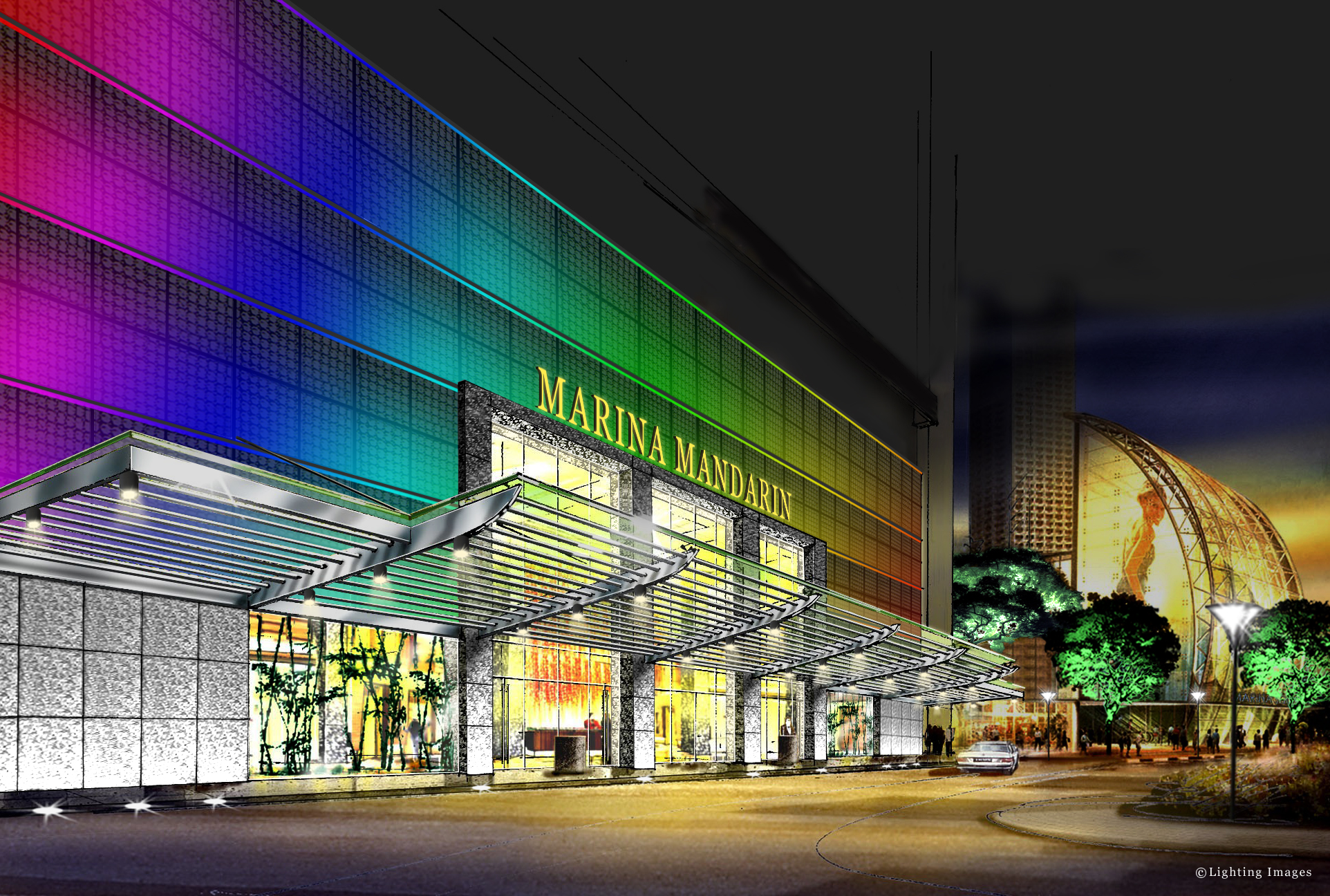 we designed the lighting for the renovation of the Marina Mandarin Hotel in Singapore. Below are the pictures of the original façade lighting proposal and the final realised façade lighting. The first with RGB color changing LEDs, then single T5 tubes to practically a bare front! Spot the difference? 🙂