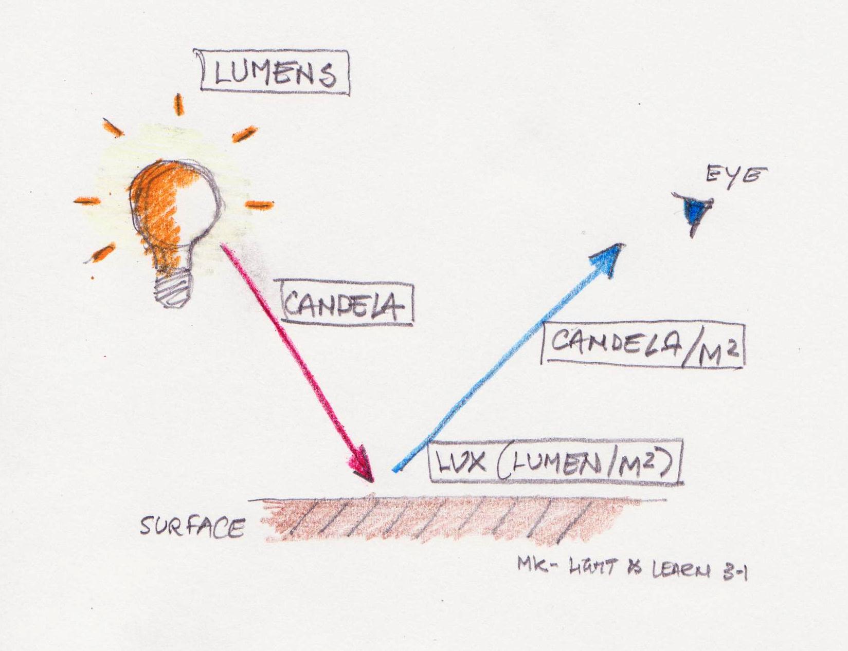 Light & Learn 3-1 : So here we go with the first Light & Learn…Now this is very basic, but you would be surprised how many people (lighting salesmen for instance!) don’t know the difference between a lux and a lumen, one of the basic units in lighting. I was ever shown it in a very simple way which I have sketched below J