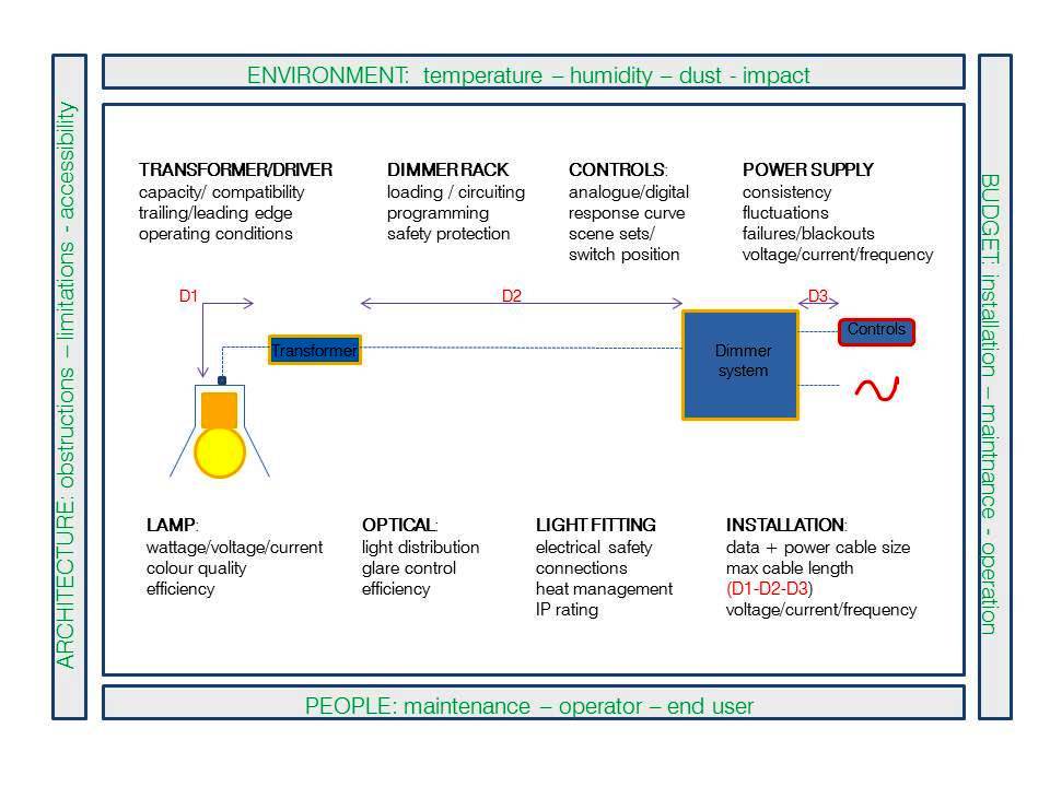 I spent a large part of the day yesterday analysing the chain of components and variables that could possibly influence the LED lighting infra-structure and its resulting lighting performance. The challenging thing in lighting is that there are so many components and variables part of the lighting chain of events that it is sometimes hard to pinpoint where the cause or origin of a malfunction, failure or under performance lies. The lighting manufacturer/ supplier will be quick to point the finger to the dimmer manufacturer who in turn will be looking at laying the blame on the installation contractor and the electrical infra-structure who in turn will be pinpointing the operator/ end user for careless or unauthorised usage.