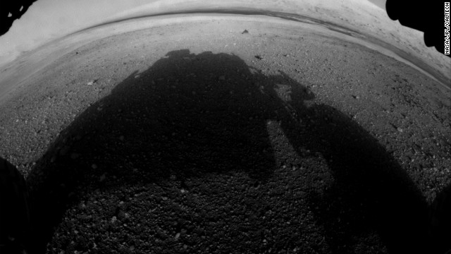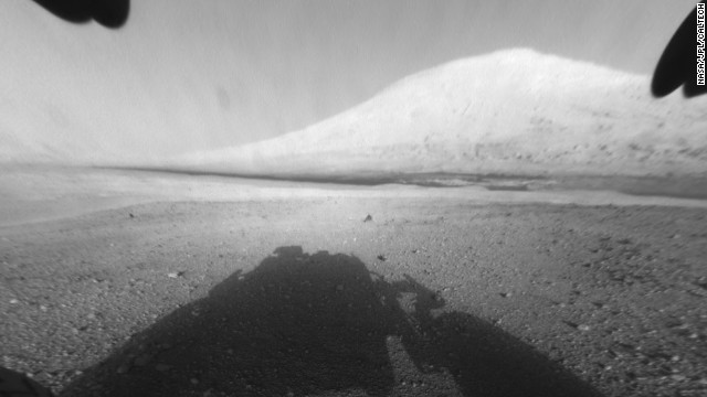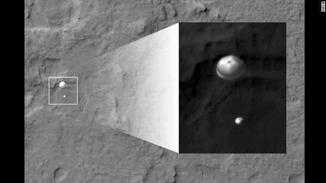 Pictures below: Mars on approach, an artist rendering of the Curiosity and the first B/W pictures after landing.