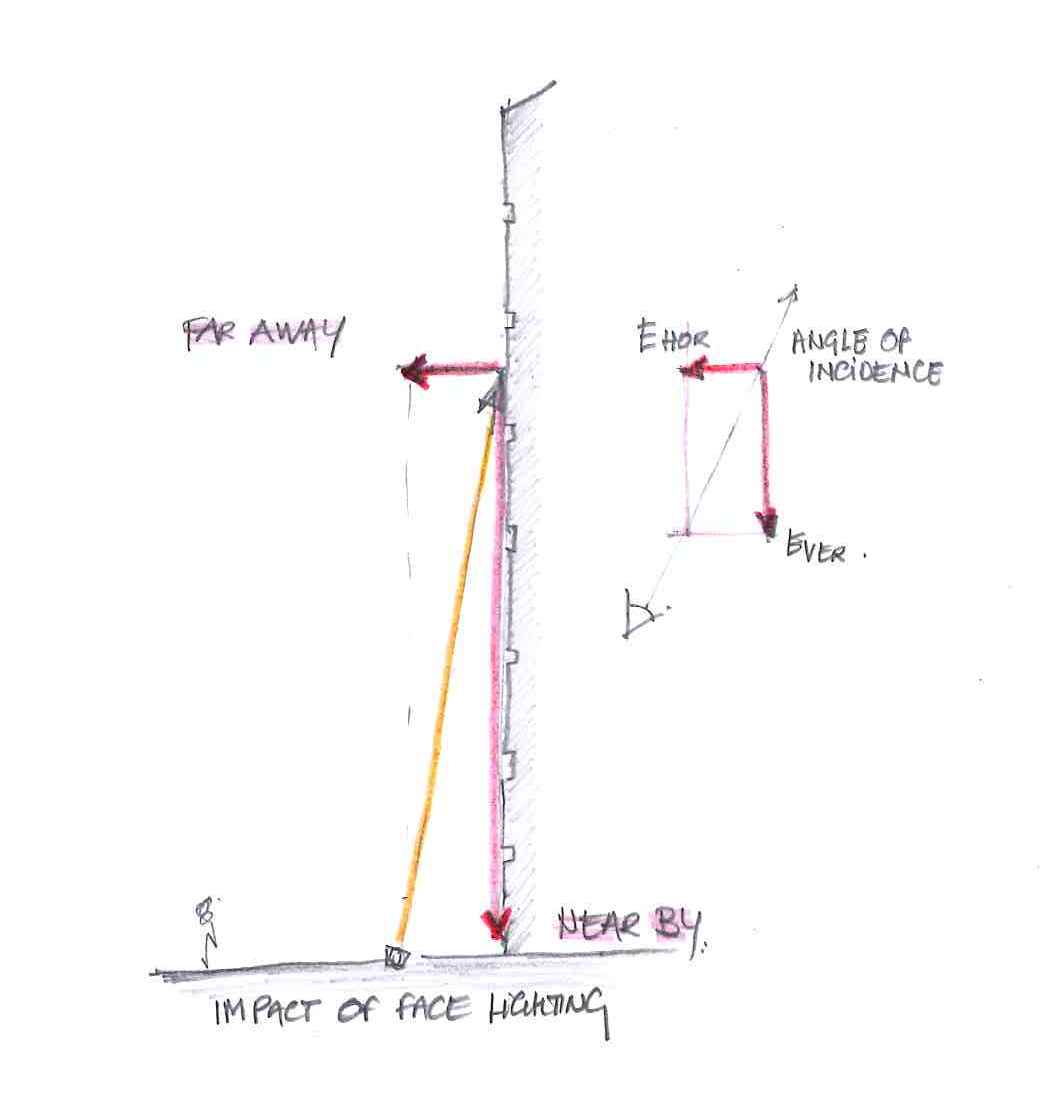 Light & Learn 3-17: When it comes to façade lighting, angle of incidence is critical. Façade lighting is generally a balanced combination between lighting the building as a landmark (viewable from a distance) and lighting of the building on arrival (at street level). The steeper the angle of incidence (light position close to the building) the lower the resulting horizontal lighting component, which is the important lighting vector for far away viewing. The downward component is however strong. You will note that (flood)lighting of high towers often results in a glow when viewed from far away and a strong light when viewed from the street nearby.
