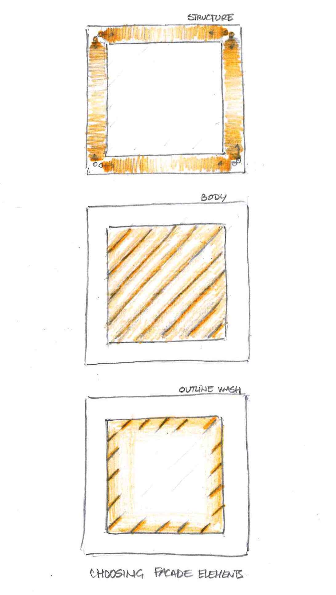 Selecting what to light (and what not) is another component of façade lighting. Floodlighting everything is possible but generally result in a dull and monotone lighting effect without depth and contrast. Striking a balance between lighting the structural elements (beams, columns, localised) and the other vertical surfaces (façade planes) is the challenge of each design. The sketch below visualises the options
