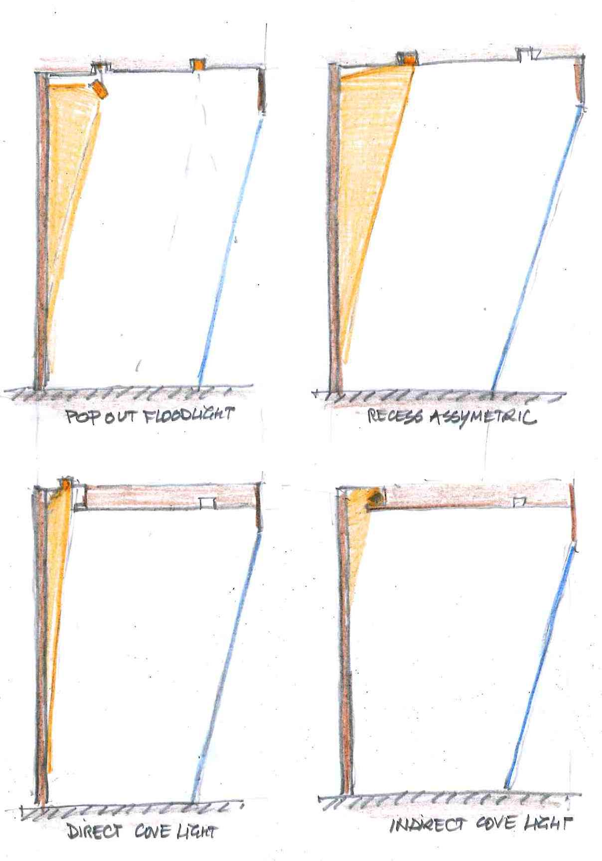 Light & Learn 3-18: Here are some of the wall wash solutions we have been investigating. We have not decided on the final design solution, though I have a pretty good idea what we will select. Final decision will be made once we have weighted the costs and energy loads of the options. Sustainability remains key to every solution!